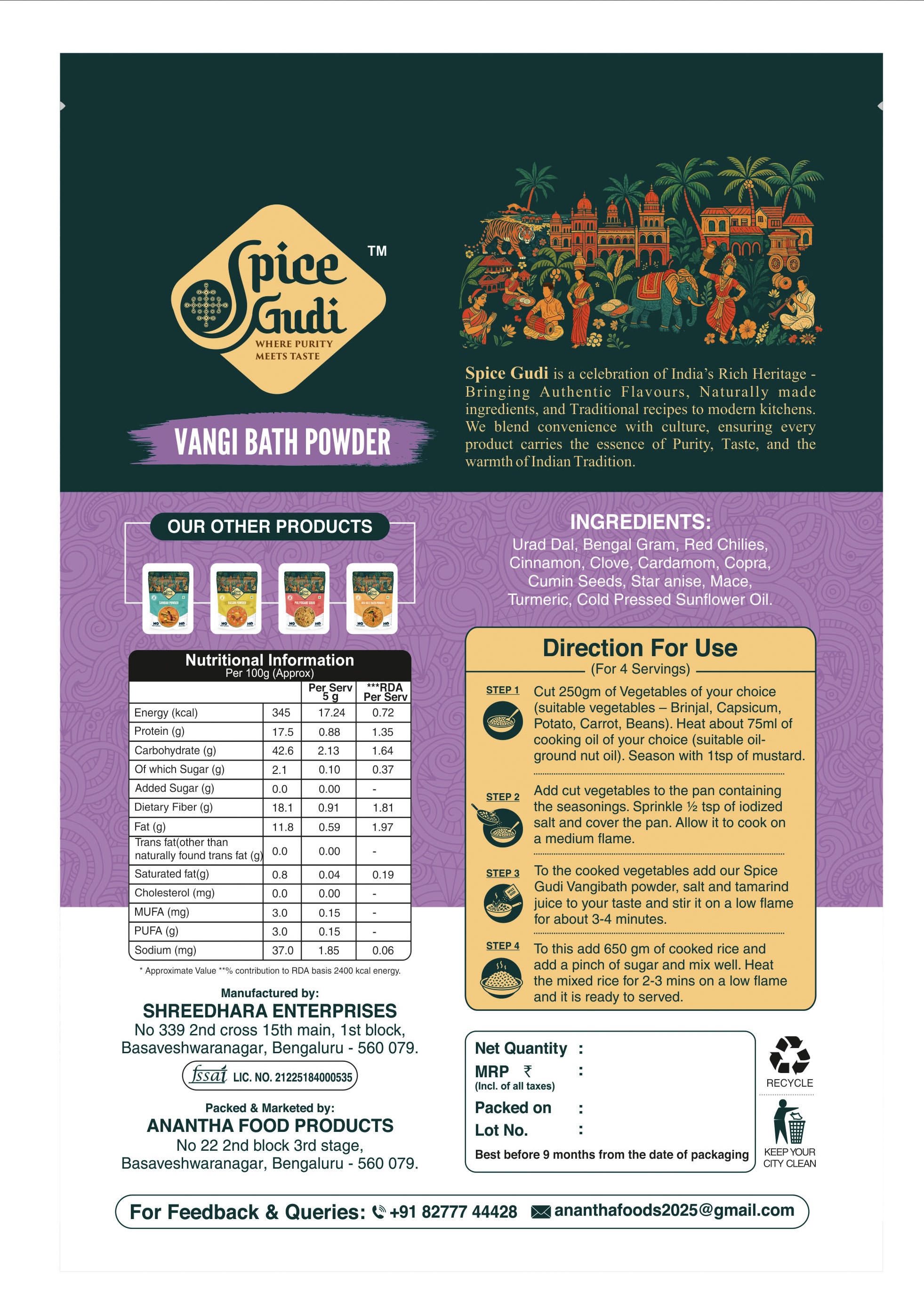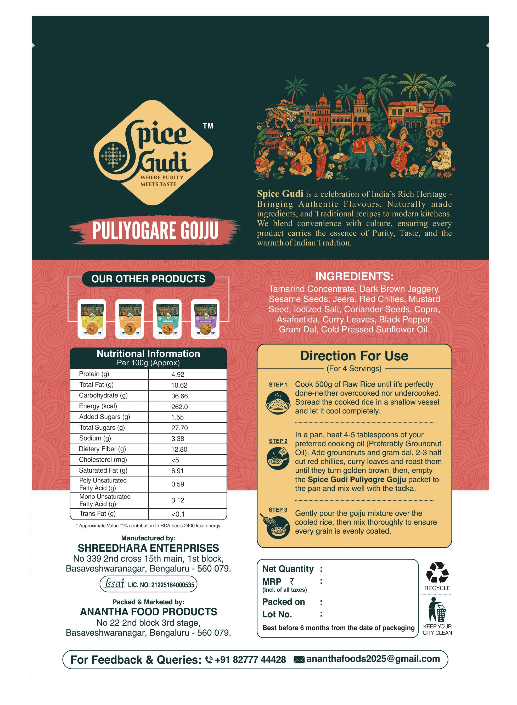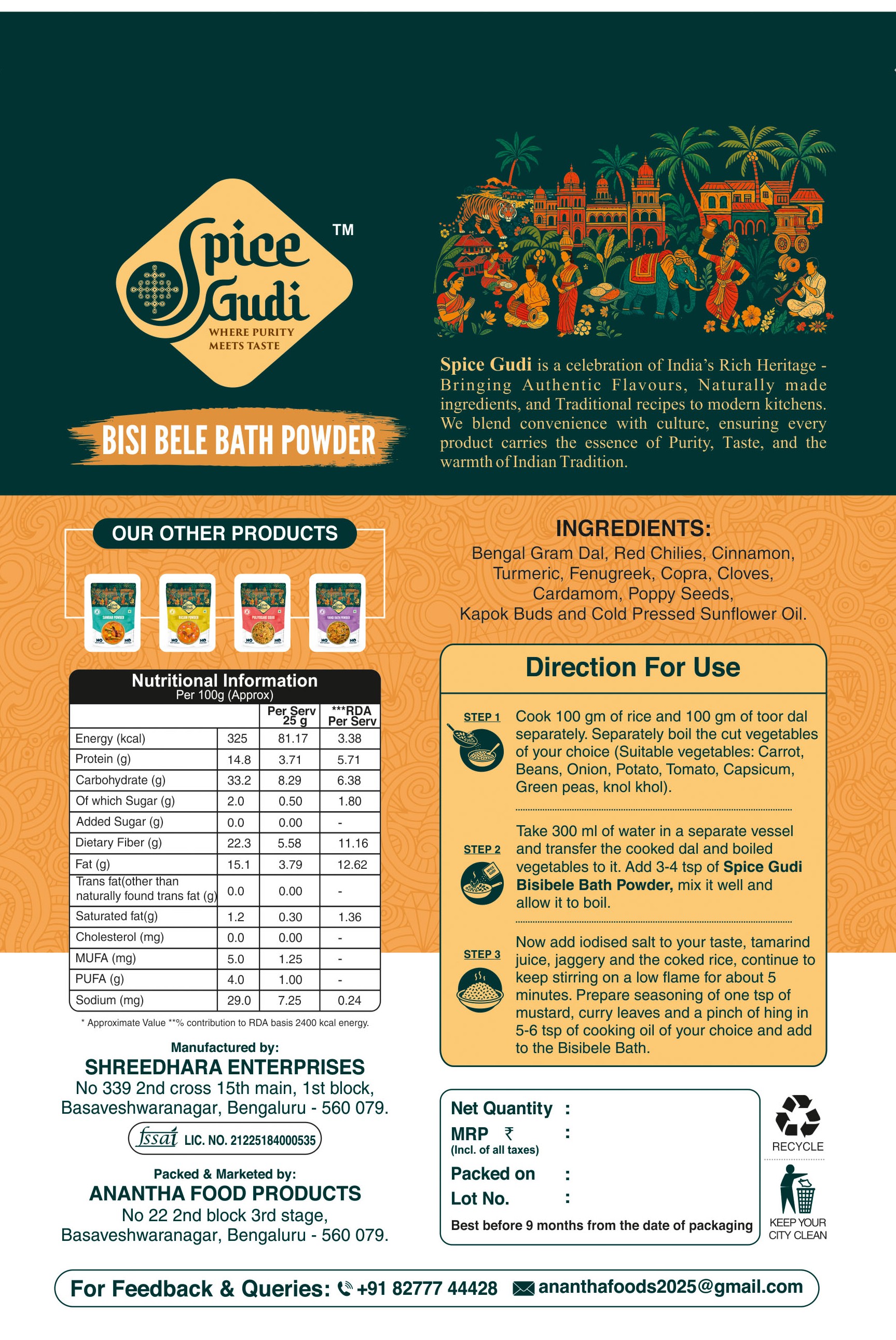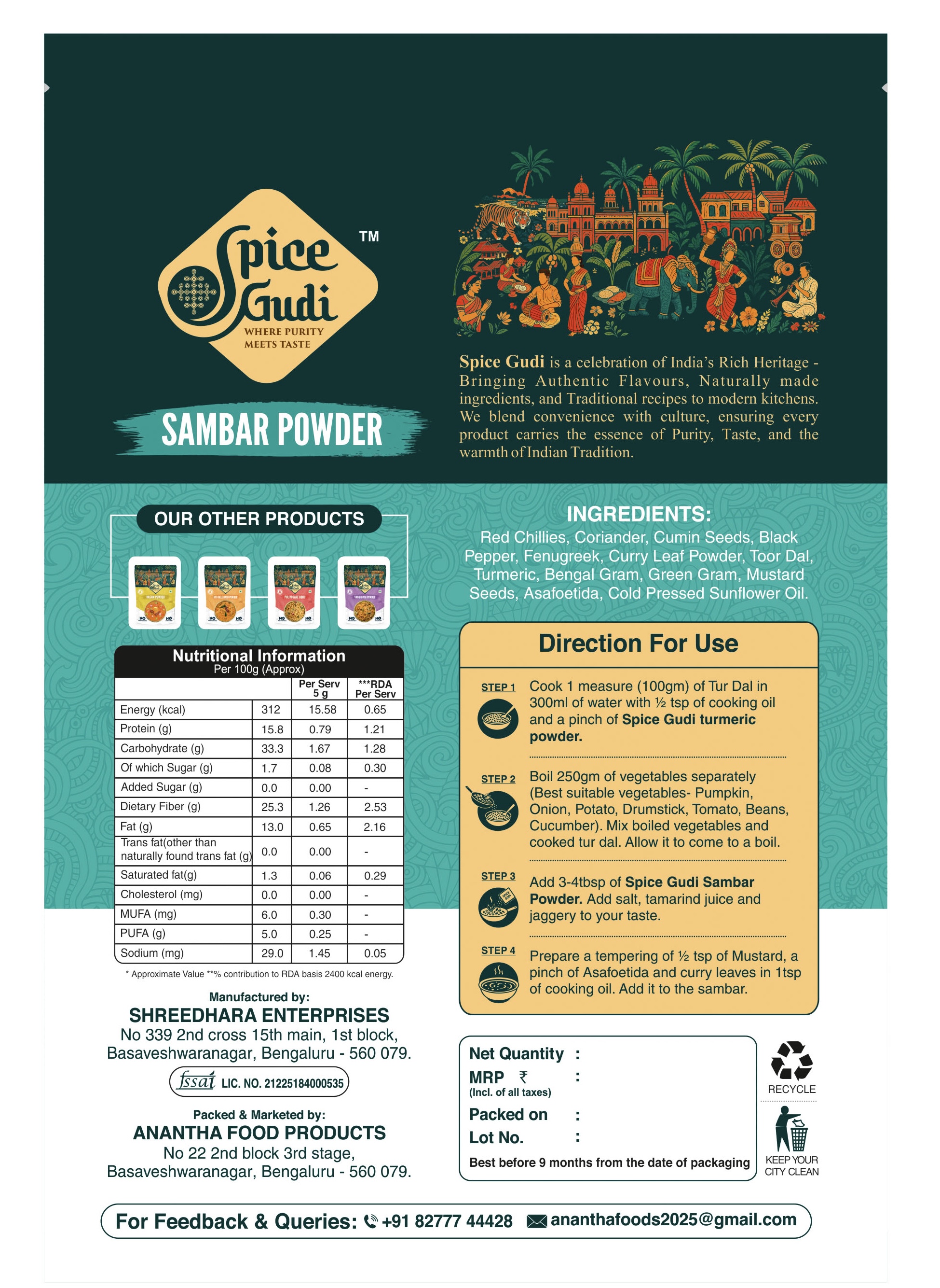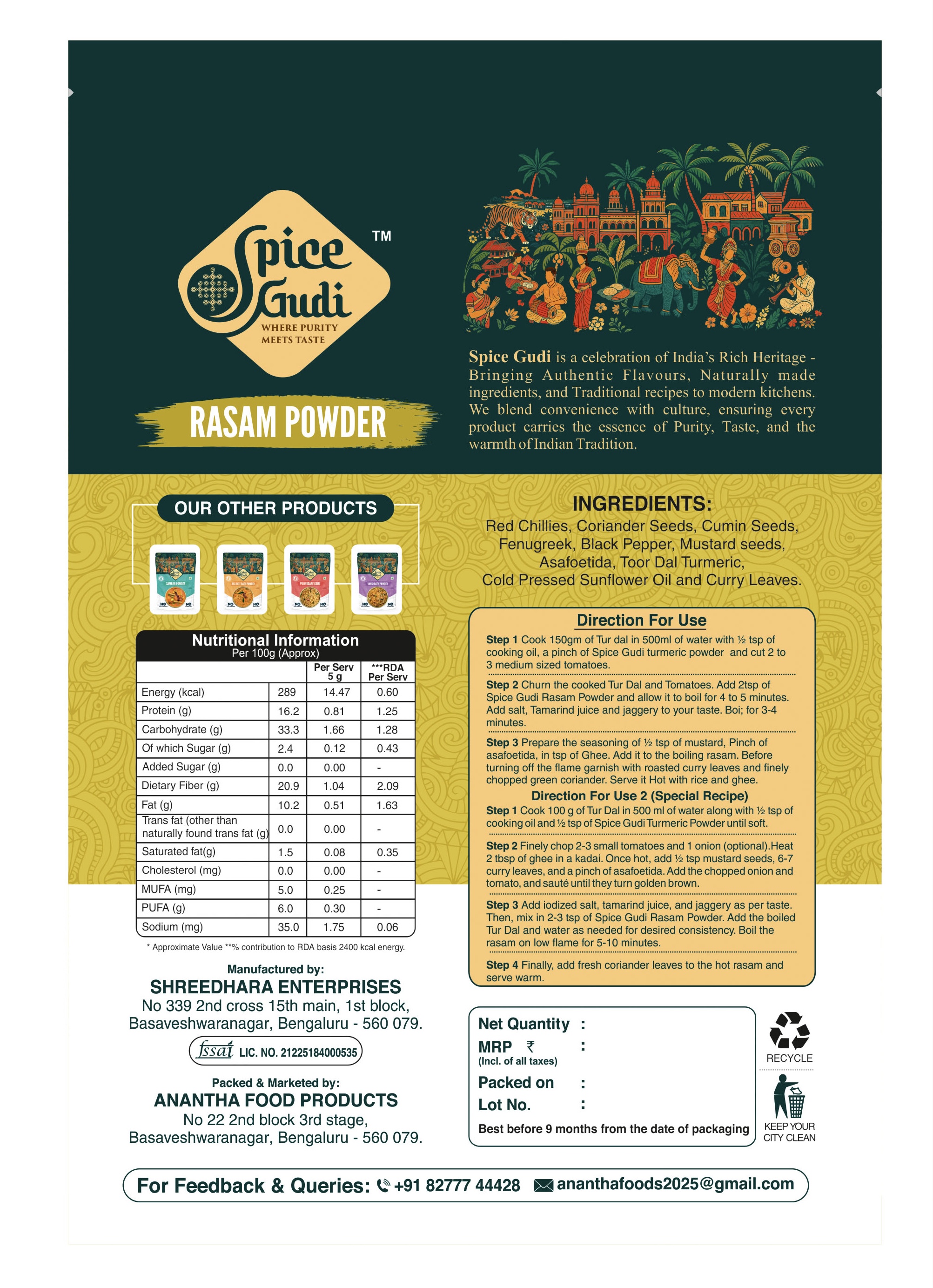 Spice Gudi is a celebration of India's Rich Heritage - Bringing Authentic Flavours, Naturally made ingredients, and Traditional recipes to modern kitchens. We blend convenience with culture, ensuring every product carries the essence of Purity, Taste, and the warmth of Indian Tradition.